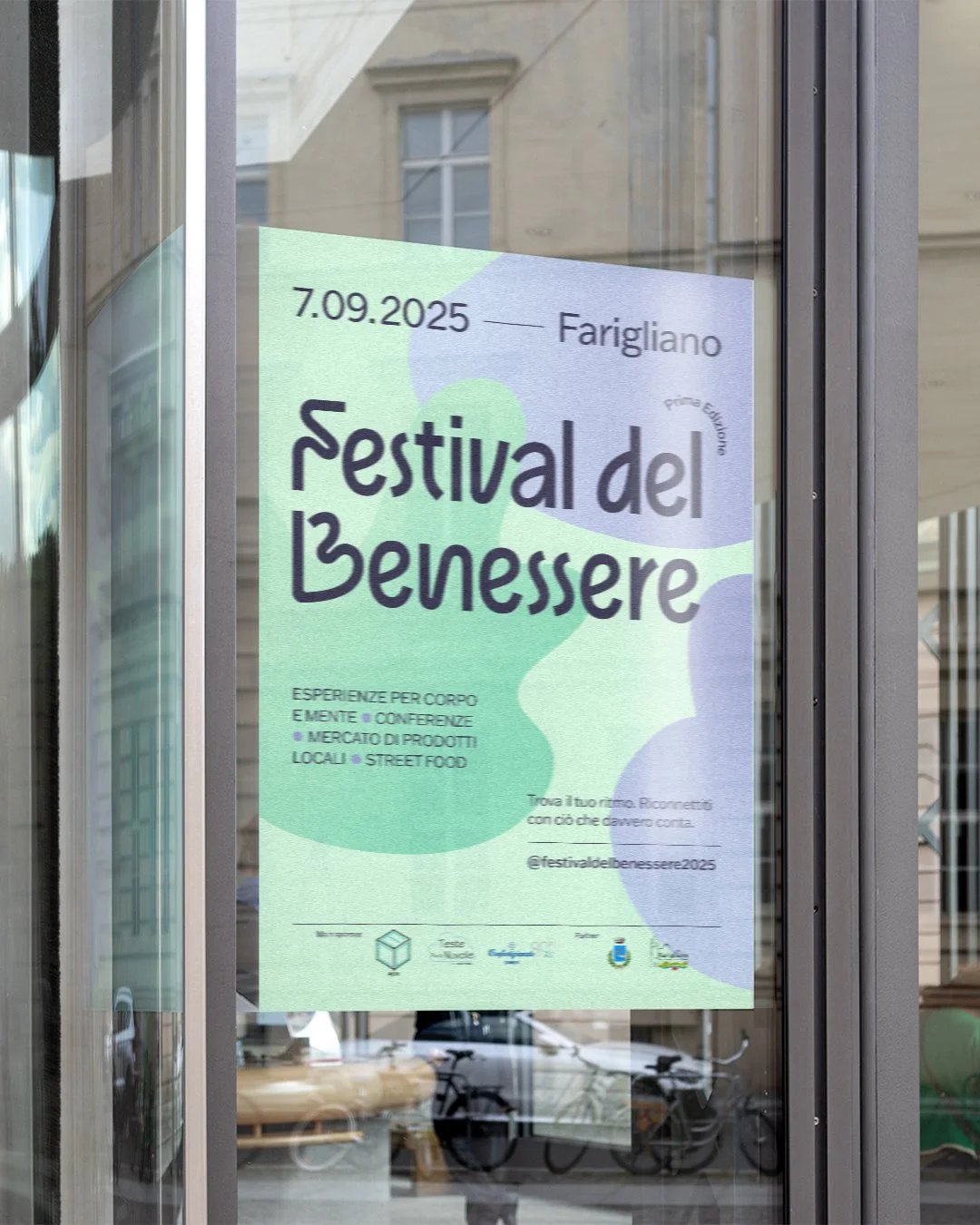 The festival identity flows with that idea: a fluid logotype, four organic shapes echoing the festival’s four wellness pillars, and a palette of soft green and purple chosen for their calming, almost meditative energy that inspires balance and creativity.
